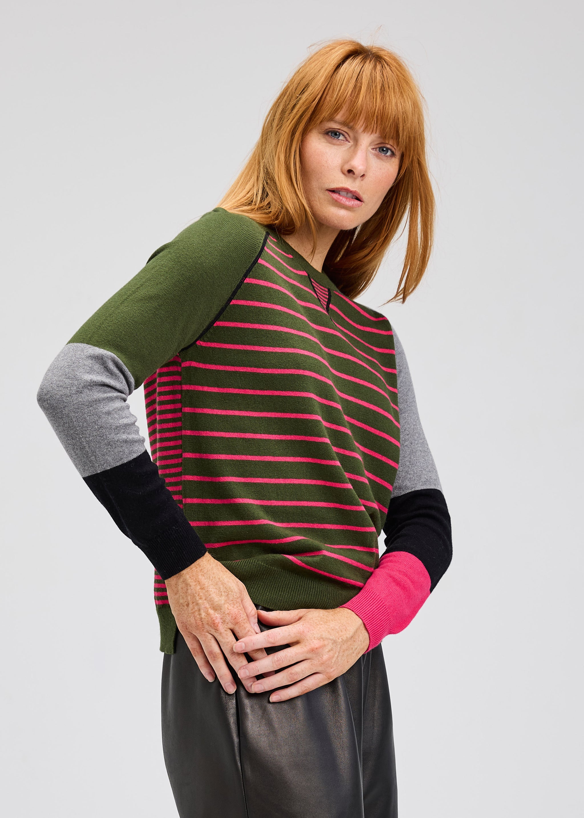 You'll love the bold and delicate stripe detail of this new sweater from Zaket & Plover. It's olive base is accented with thin pink striped along the body, while it's sleeves feature a chunkier colorblock design in black, grey, pink, and olive.