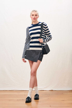 This lighter weight cashmere keeps your eye guessing with its striping in different widths. Easy to dress up or down with a skirt or jeans.