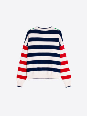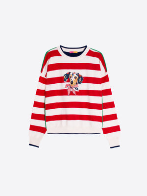 Celebrates your love for all things furry and fabulous. This red and ecru striped sweater features a fun dachshund embroidered front and center. With a round neck, green details on the shoulders, and ribbed cuffs and hem.