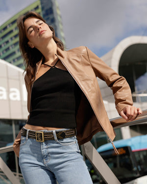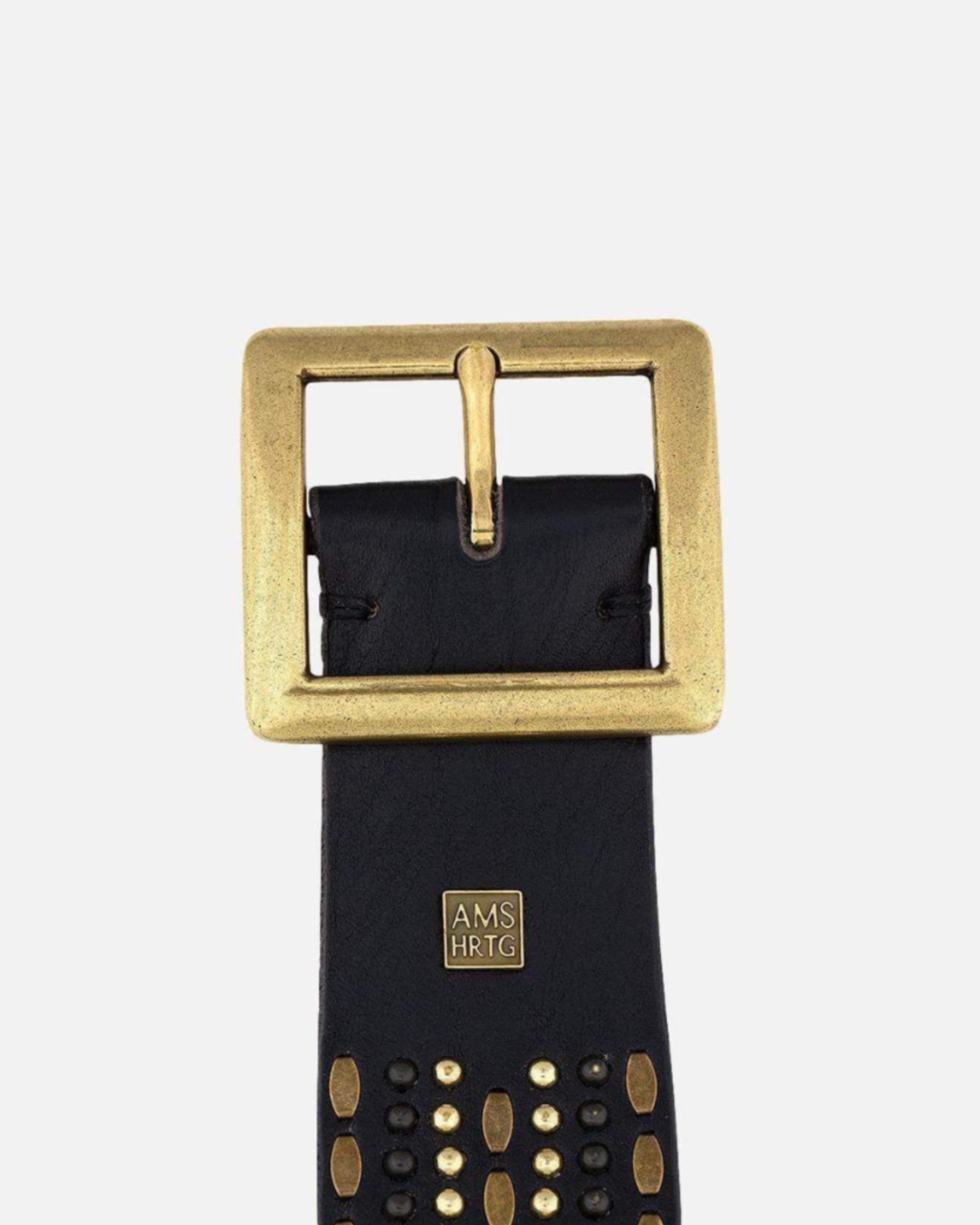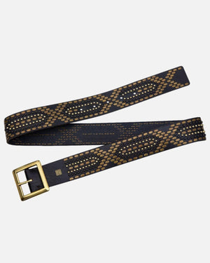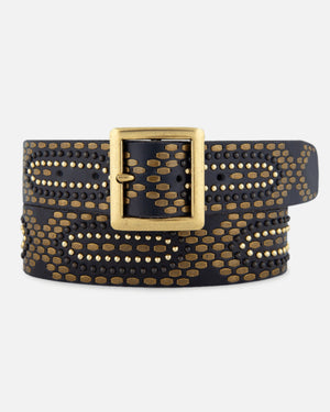 The geometric designs on this studded leather belt are sure to add glam to your style. With a beautiful mix of bronze, gold, & dark metal studs – this design is a showstopper at every level. Your T-shirt & jeans have never looked better than they do with this studded beauty slipped around your waist. Featuring a gold square buckle & premium leather.