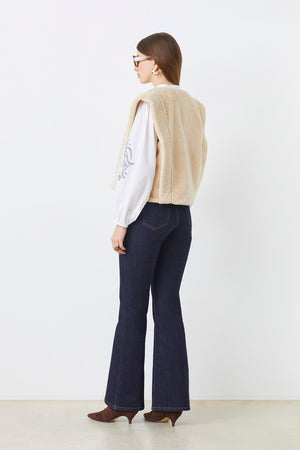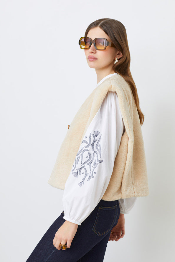 A cozy yet refined layering piece, this sleeveless shearling vest adds warmth and texture to any look with its soft cream finish and minimalist toggle/button closure.