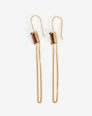 The Ember Earrings in 18K Gold Vermeil are inspired by royal crown jewels. A bold baguette-cut Garnet is held by a modern, minimal setting and contrasted with a delicate suspended curb chain drop.