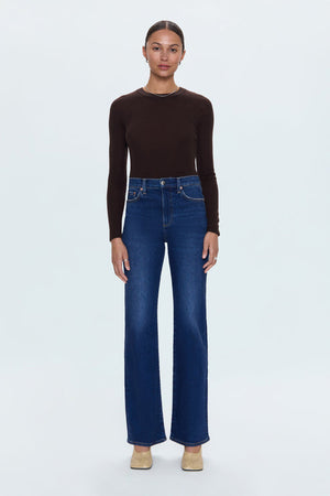 The slim boot that flatters every frame. Evie sits at a high rise with a slim fit through the hips and thighs before opening to a subtle bootcut, creating long, lean lines with just the right amount of flare. The full-length 33" inseam elongates the silhouette, making it endlessly versatile for heels or boots. Crafted from comfort stretch denim in Penthouse, a dark indigo wash with refined fading that adds depth and sophistication.