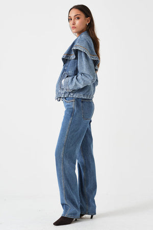 Seventy + Mochi's Fara Jacket is a statement denim piece with a removable cape for endless styling. In a relaxed fit with a drawstring waist and fun embroidery trim details. All seventy + mochi products are crafted with a "Consciously Kind" strategy utilizing recycled and organic fabrics and ethical dying processes.