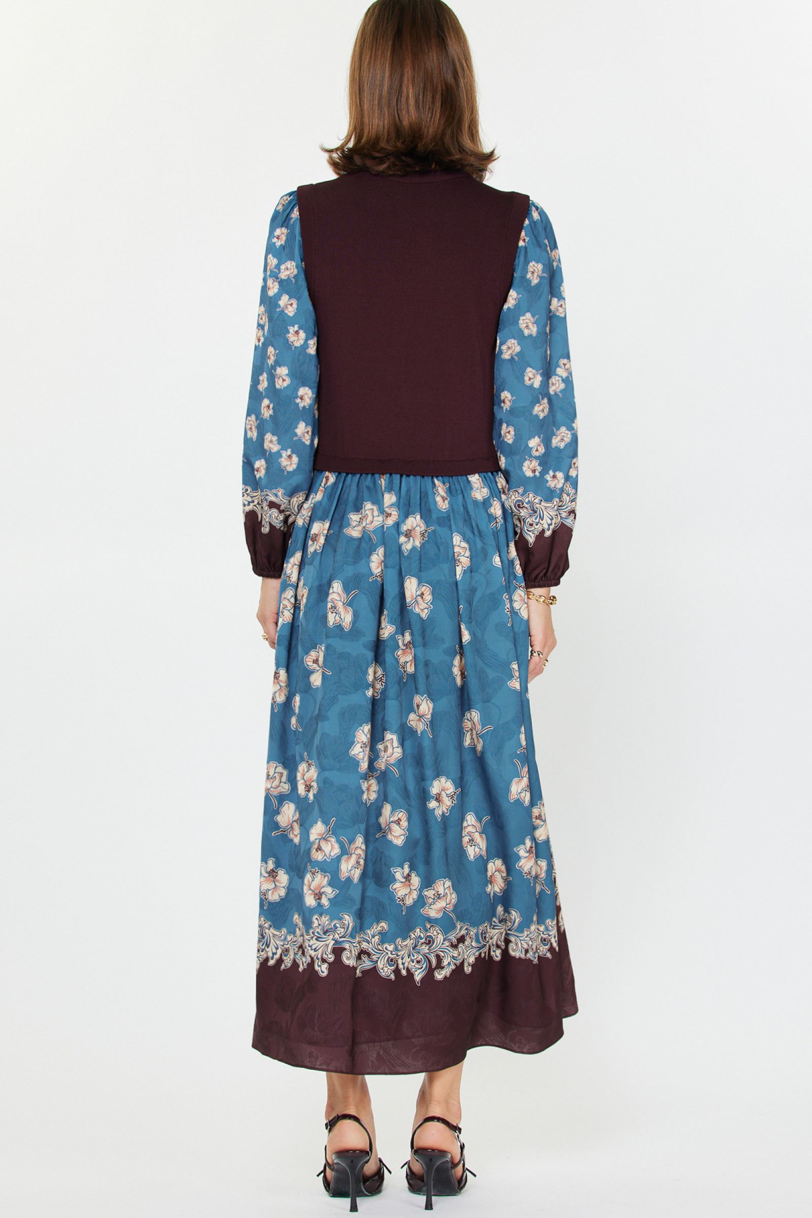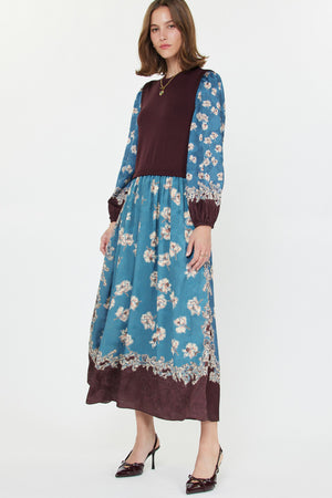 Polished and effortlessly chic, this mixed media dress pairs a cozy knit sweater top with a flowing woven floral midi skirt, accented by a contrast border print for a touch of drama. Long sleeves with elastic cuffs and a relaxed silhouette make it easy to wear, perfect for brunch, weekend shopping, or casual dinners.