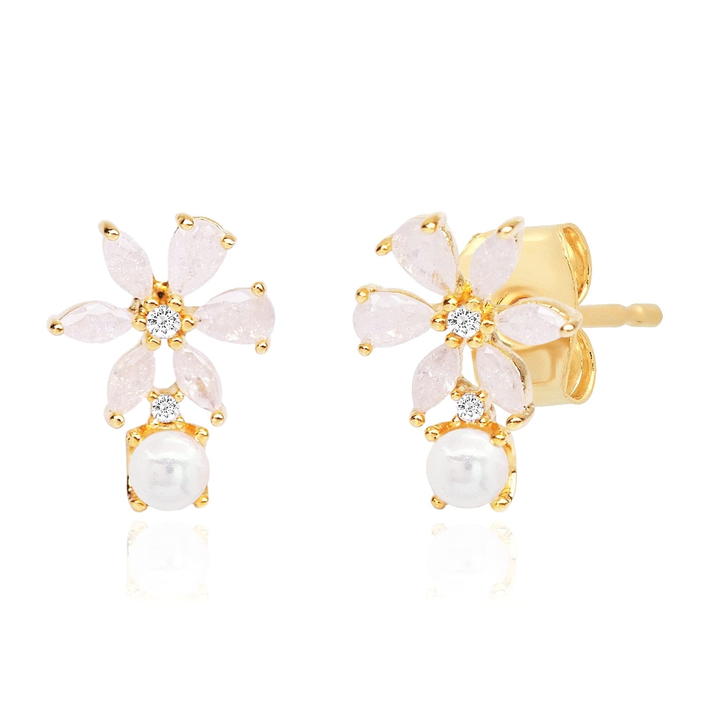Small in size, big on charm—these petite flower studs bloom with delicate CZ petals and a dainty faux pearl center. Their soft shimmer and floral silhouette make them a sweet pick for everyday wear or dressing up your ear stack.