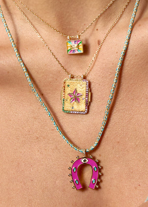 The FUCHSIA HORSESHOE necklace by MYA—BAY is gilded with 24-carat recycled fine gold . Mounted on a flashy cord, its large horseshoe-shaped pendant symbolizes luck, success, and that little something extra that makes all the difference. At 52 cm long , it can be worn long to brighten up a silhouette. The fuchsia electrifies this jewel like a pop nod to the Wild West.