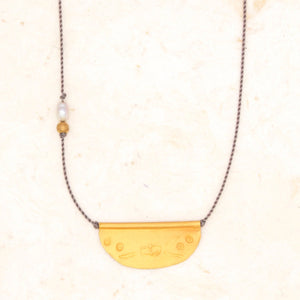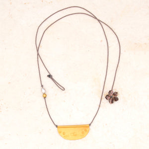 Garden talisman is handmade silver, covered in 24 karat gold. Grey nylon, asymmetrical antique pearl bead detail, pearl flower button closure.