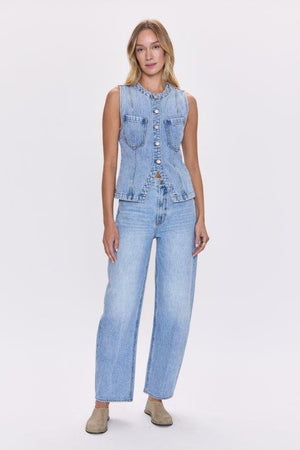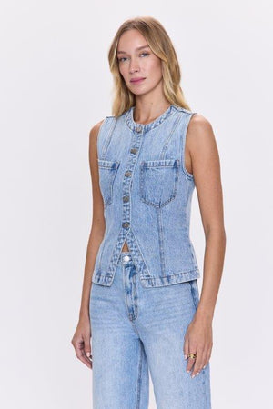 Add a modern layer to your summer rotation with the Gia Vest. Crafted from structured yet comfortable denim, this collarless silhouette features a clean round neckline and a flattering fitted shape that hugs in all the right places. The design and streamlined seams make it perfect for pairing with everything from matching jeans to floaty skirts. Wear it buttoned up as a top or open as a lightweight layer—this one does it all.