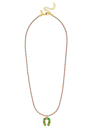 The GREEN MINI HORSESHOE necklace by MYA—BAY is gilded with 24-carat recycled fine gold . Its small horseshoe-shaped pendant is colored with a bright green enamel—a symbol of luck, success, and positive energy. Mounted on a cord, it measures 39 cm + 5 cm of extra chain for an adjustable and lightweight fit.