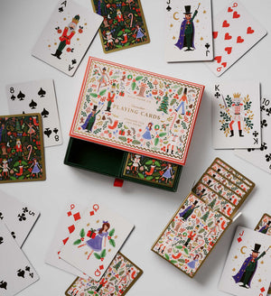 A standard playing card deck in a keepsake tuck box, illustrated with whimsical Nutcracker-inspired artwork. All cards feature full-color illustrations, with additional decoration on all face cards and jokers. The deck includes 56 standard cards, and are produced by the United States Playing Card Company.