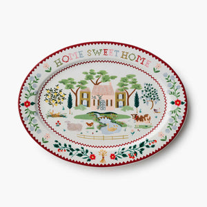 Serve hors d'oeuvres or family-style dishes on this elegant porcelain tray, featuring charming farm illustrations and cross stitch-inspired details, metallic gold accents, and a gold-painted edge.