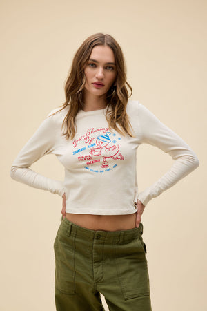 Accented with a crew neckline and vintage inspired single needle ladder stitch at all hems.