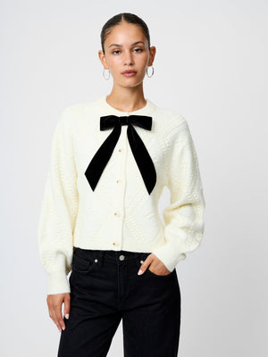 Your knitwear collection just got sweeter. The Kitty Bobble Contrast Cardigan combines timeless texture with a touch of playfulness. Its soft bobble knit and statement velvet bow bring a feminine finish to classic coziness.  Perfect for dressing up your everyday denim or pairing with a sleek skirt for the season’s soirées.