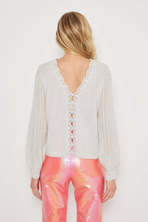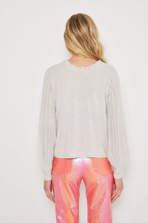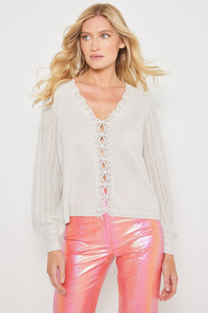 Love is in the details on this sweater from Lisa Todd. Lacey Lover is a delicate petite button-front reversible Cashmere cardigan, featuring a lace neckline with volume through the pointelle stitch bell sleeves.