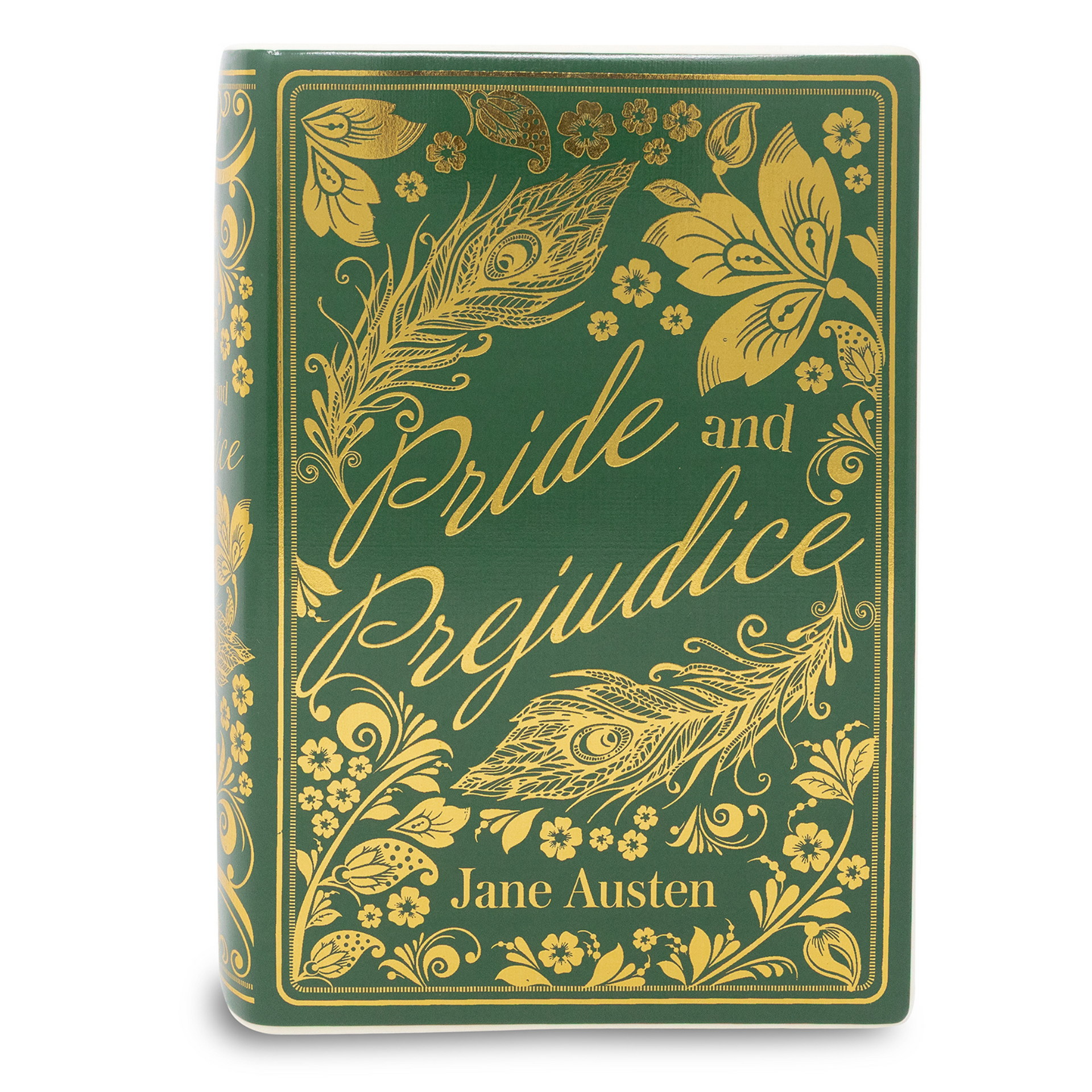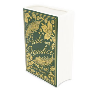 This large ceramic book vase is the perfect piece for any book lover's space. Designed to mimic a hardcover book, the vase features sculpted pages, with a wide top opening for flowers, desk supplies, utensils, and more. The cover features art inspired by Jane Austen's beloved novel Pride and Prejudice to adorn your space with classical and bookish charm. This collector's edition features shiny gold foil details.