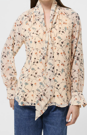 Floral wisps undulate on the Leithia Whispy Chiffon Tieneck Top. Fashioned with streaming ties that can be left to flow in the breeze and long sleeves with flared one-button cuffs. Tuck into a trouser for workdays or let it flow over jeans.