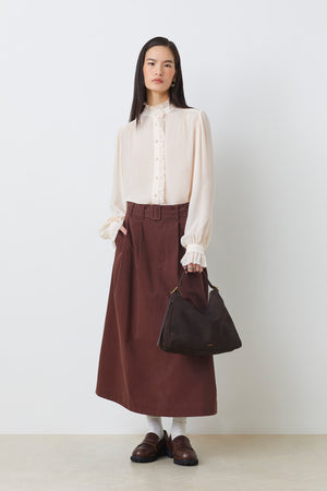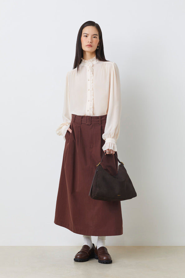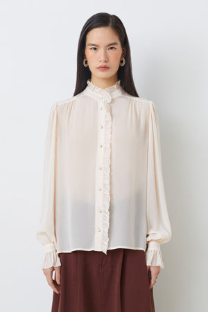 The Leonor Shirt is a poetically pretty blouse, cut from a lightweight sheer fabric and decked in ruffles from collar to cuffs and button placket. This romantic piece pairs with everything from jeans to flowy skirts.