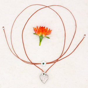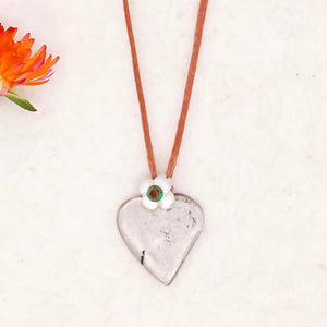This Large Heart Milagro from River Song is a sweet symbol of love and gratitude. A matte finished sterling silver heart is attached to a taupe nylon cord with a green turquoise gemstone on a mother of pearl forget-me-knot flower. It's sliding knot closure also features this mother of pearl flower detail.