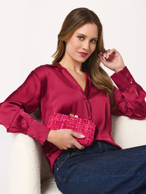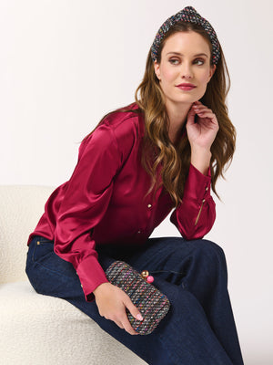 The Mabel Minaudière is your new secret weapon for instant glam. Wrapped in textured tweed and topped with a dual dot clasp, this structured clutch adds just the right amount of sparkle and color to any outfit. It’s compact enough to keep things classy but roomy enough to stash your night-out essentials. With a detachable gold chain strap, you can swing it crossbody or carry it as a clutch—it’s a total show-stealer either way.