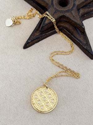 Inspired by Moroccan tile designs, the Madras Necklace features a larger medallion with a repetitive dot pattern. This design echoes the symmetry and balance found in mandalas, perfect for meditation. Embrace the mantra "Free Your Mind" with this piece, and let it guide you in finding tranquility and focus in your daily rituals.