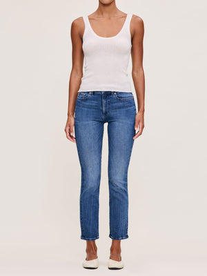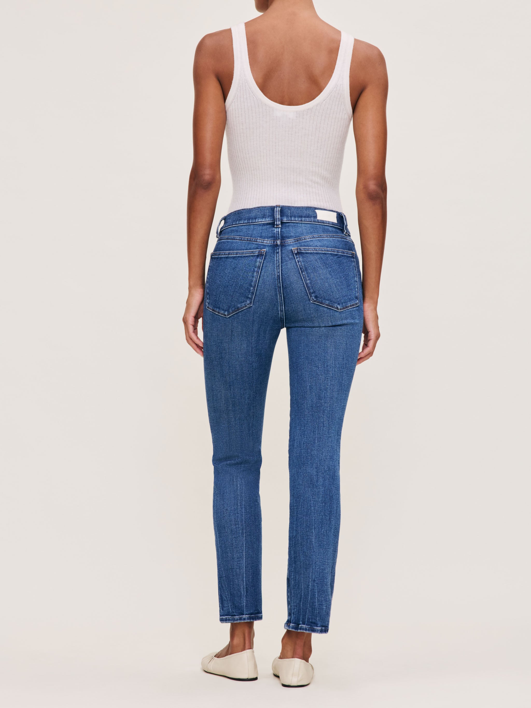 The Mara Straight Ankle is a mid-rise, ankle length straight leg fit that utilizes DL 1961's Instasculpt technology to smooth, sculpt, and conform to your body for the perfect fit. The Palm Springs wash is a bright, mid-indigo with subtle fading for a worn-in look. It features a silver shank, matte copper rivets, khaki stitching, a clean hem and an ecru back patch.