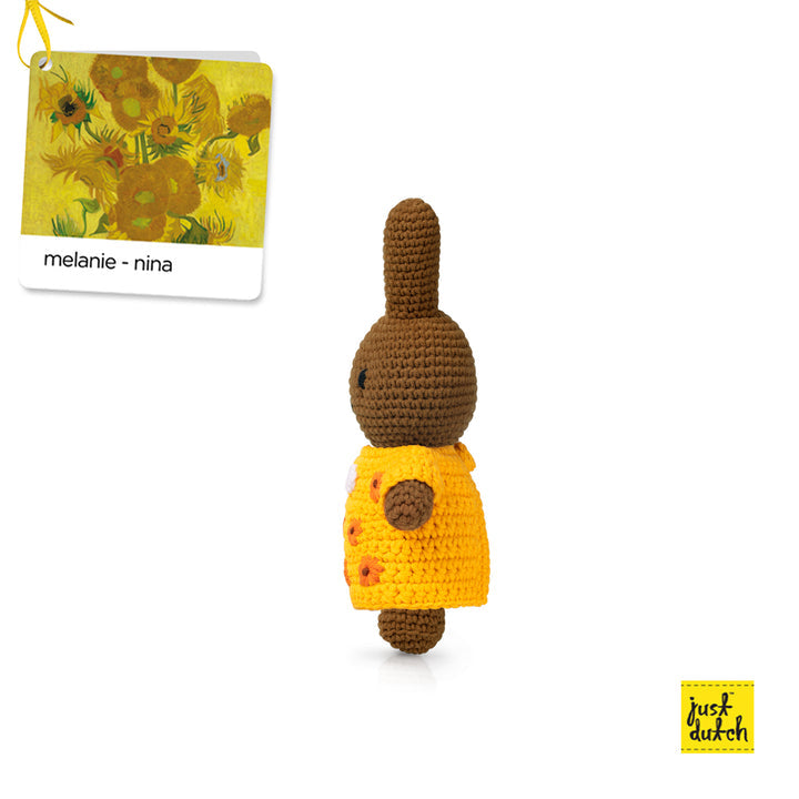 Just Dutch Melanie Handmade Crocheted Soft Toy. Enjoy Melanie in this beautiful yellow floral dress, inspired by Van Gogh'sSunflowers.