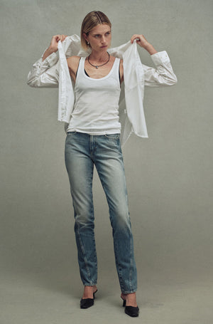 Amo's Mira Jean is relaxed in all the right places with a cigarette leg and a chic twisted side seam. This high rise denim is made for every day.