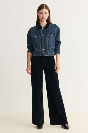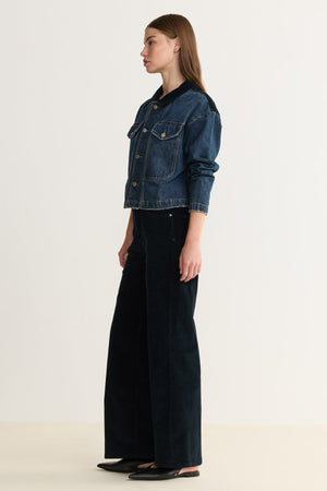 With a luxuriously laid-back look, the NCE Cord is right at home just about anywhere. Designed with a gently sculpting high-rise fit, these wide-leg cords are casual yet always sophisticated. Knight is a deep navy hue with silver hardware and a clean hem.