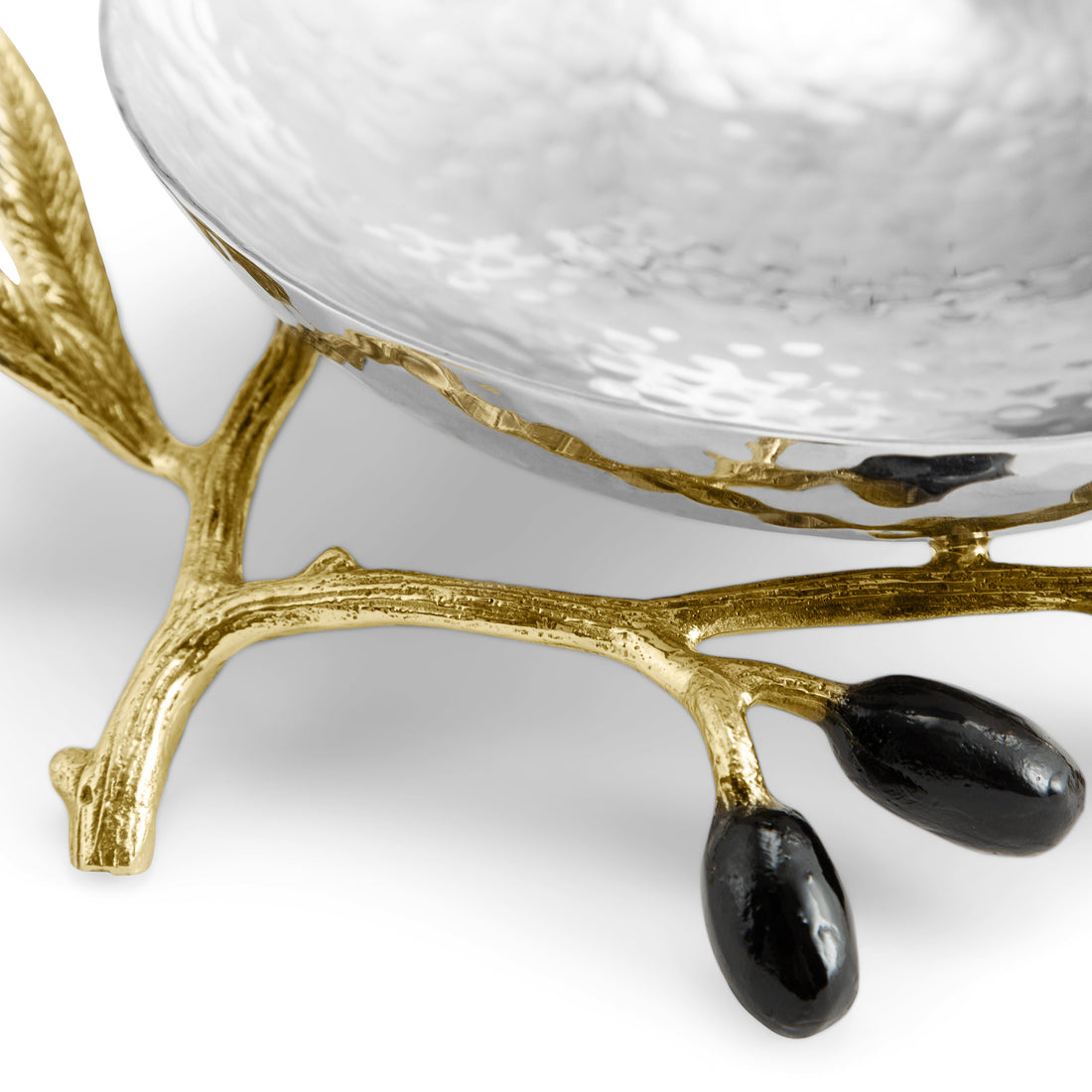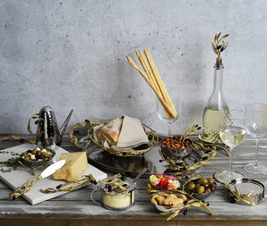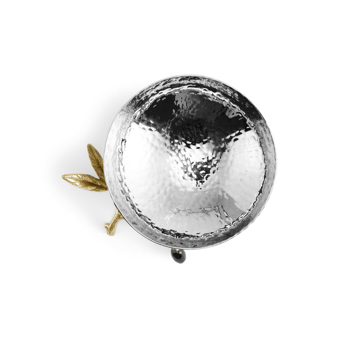 If you're a fan of Michael Aram, you need this new Olive Branch Catch All! This symbolic design representing both peace and victory is a beautiful hammered stainless steel held up by brass stems. Use to hold keys, jewelry, and other small trinkets.