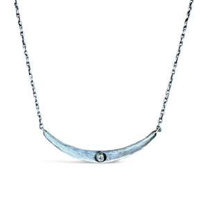 Slim and simple, this necklace from Austin Titus is made from textured oxidized sterling silver with 18k gold accents and a bright 2mm diamond (lab grown). This is a great layering piece or for wearing alone.
