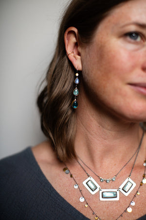These handcrafted drop earrings feature rose cut stones set in oxidized silver, accented with our signature fused 24k gold setting. Measuring approximately 2 inches in length, they offer a lightweight and vibrant design. The stones alternate between a harmonious blend of moonstone, light blue, and dark blue kyanite for a captivating "shades of blues" palette. Each pair is made to order, ensuring a unique and expertly crafted accessory.