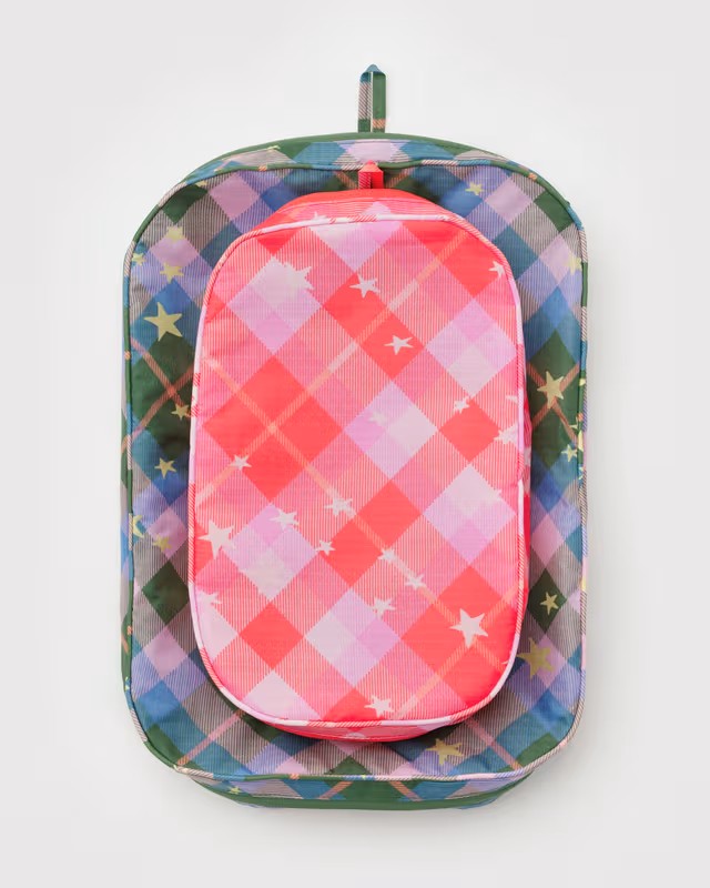 Packing made easy courtesy of Baggu! For those of us who crave order, here’s a 2 piece set to keep it all together. In fun colors and chic prints, transport all your goodies in style!