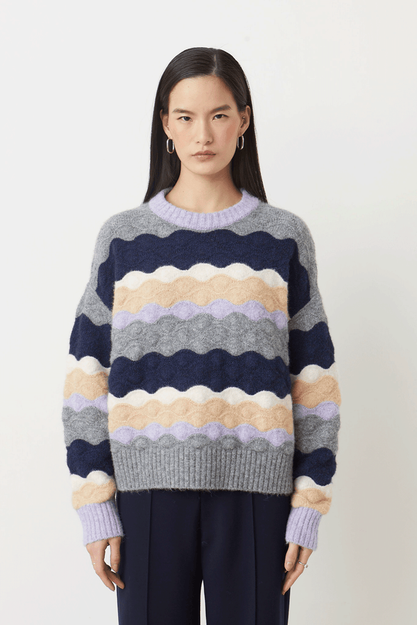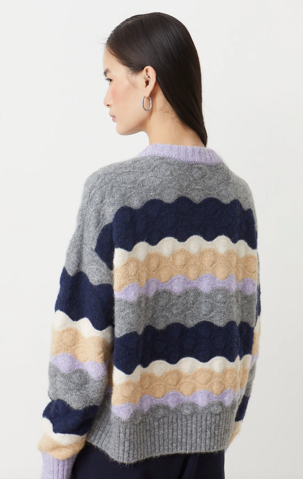 The Panayo Sweater is a cozy, playful knit distinguished by its wavy, multicolor stripe pattern. Featuring a textured, dimensional look with its crew neckline and ribbed cuffs accented in lavender for a subtle pop. Its relaxed fit and plush feel make it a cheerful yet versatile piece for casual, cool-weather styling.