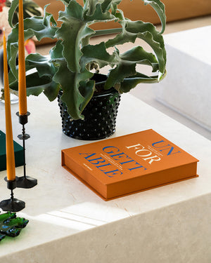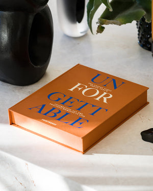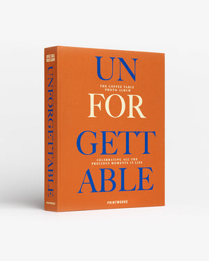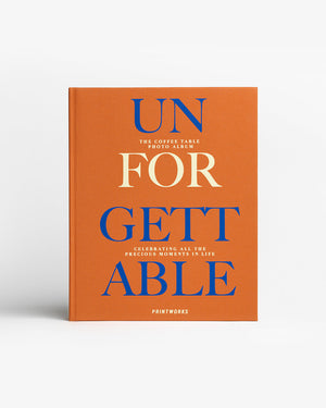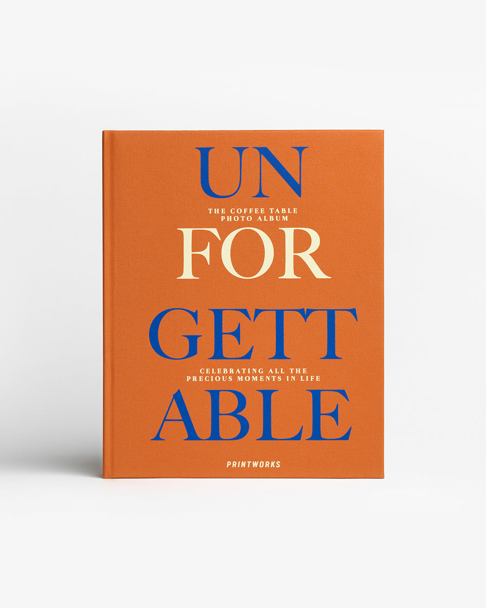 Discover our Unforgettable coffee table photo album featuring an elegant, terracotta cloth cover with blue and cream-white text.
