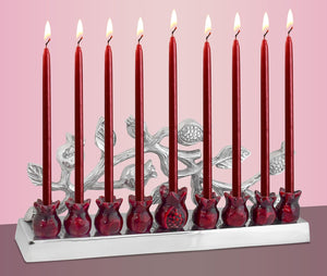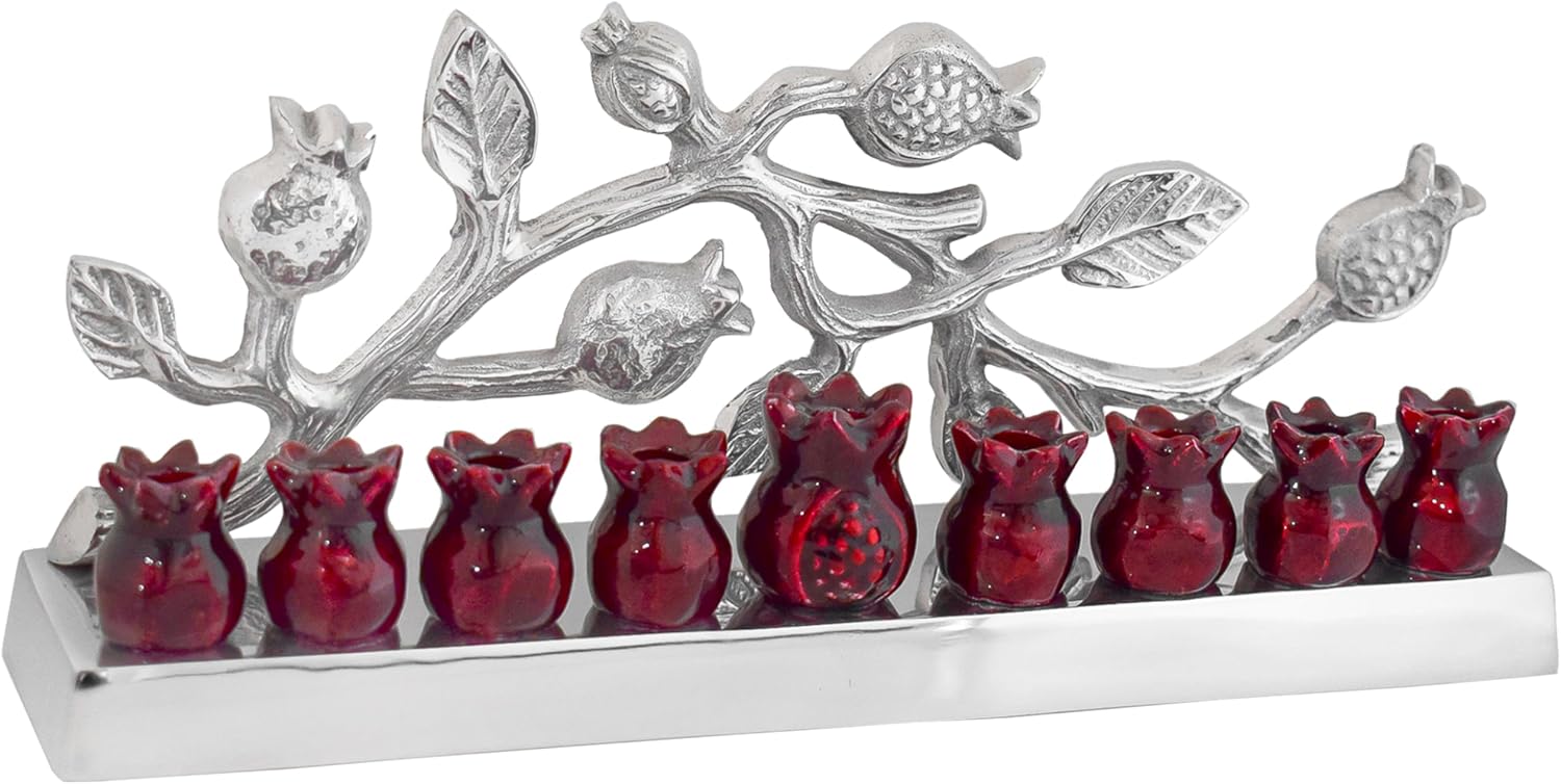 Light up the night with this stunning silver toned menorah from Ner Mitzvah. This striking menorah features a silver branched pomegranate design for the back, with the base being red pomegranate candle holders.