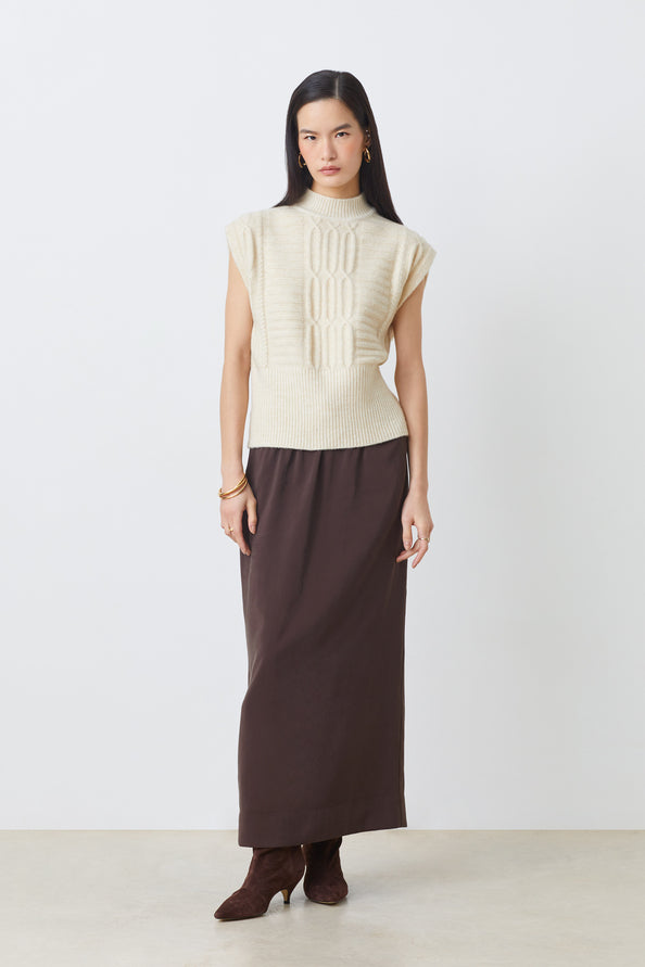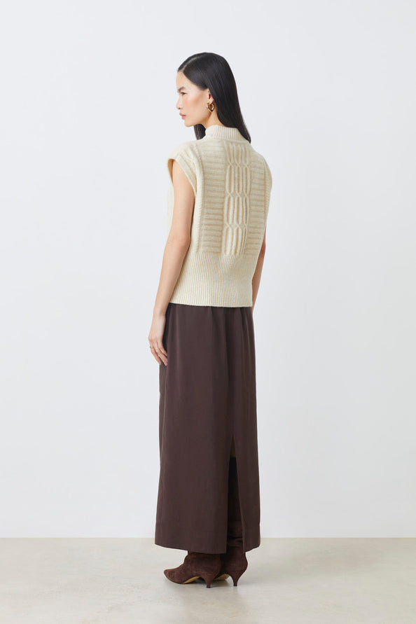 The Suncoo Prusse Vest is a high-neck sleeveless knit that’s perfect for layering or wearing solo on cool days. Its sleek silhouette keeps things chic while the soft fabric ensures all-day comfort. Play with contrasts by pairing it with your favorite jackets or skirts for a fun and fresh look that’s anything but basic.