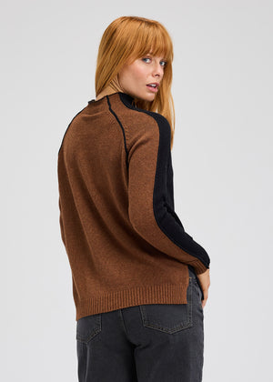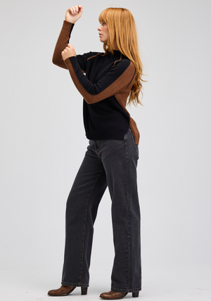 You'll love this chic and cozy sweater from Zaket & Plover. This neutral colorblock design features a brown front and black back with delicate details from the turtleneck down around the armpits. If you'd prefer the black front with brown piping, simply turn this sweater around!