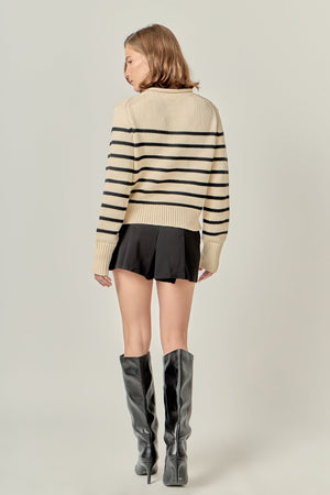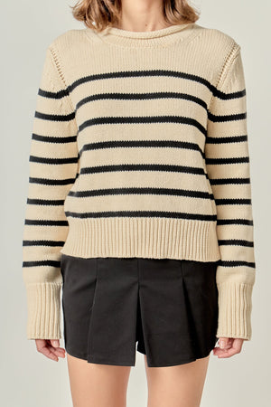 Crafted from a soft, cozy knit, this sweater features a relaxed fit with a classic crew neckline and bold horizontal stripes that add a touch of nautical charm. The wide ribbed hem and cuffs lend subtle structure, while the neutral palette ensures endless styling versatility. Whether paired with tailored trousers, denim, or layered over a slip dress, this sweater brings warmth and sophistication to any look.