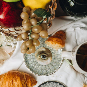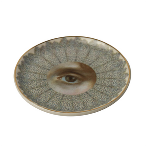 The "Elizabethan Lady’s Eye Dish is a 4-inch porcelain piece inspired by the elegance and intricate artistry of the Elizabethan era. The central eye design is surrounded by ornate patterns reminiscent of the delicate lace and ruffs worn by noblewomen of the period. This dish captures the essence of Elizabethan sophistication, offering a timeless and evocative decorative accent that brings a touch of history and refinement to any setting.
