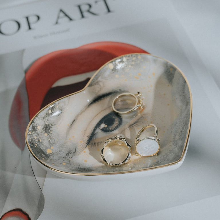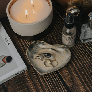 Indulge your space with the enchanting allure of our Lovers Eye Ceramic Heart Dish – inspired by the sentimental keepsakes of the past. This exquisite heart-shaped dish, measuring 5" across, is a statement of love and passion, brought to life through Spitfire Girl's artful craftsmanship.