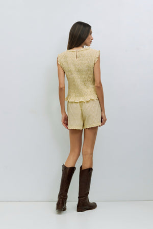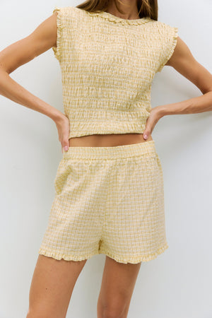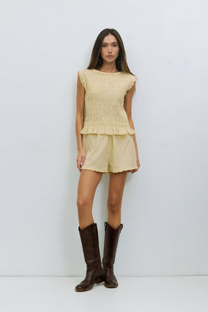 The Suri Top is crafted from crinkle plaid fabric with a form-fitting smocked body, featuring a sleeveless design with ruffle-edged armholes, a crewneck with ruffle detail, back keyhole button partial closure, and a ruffled hem.