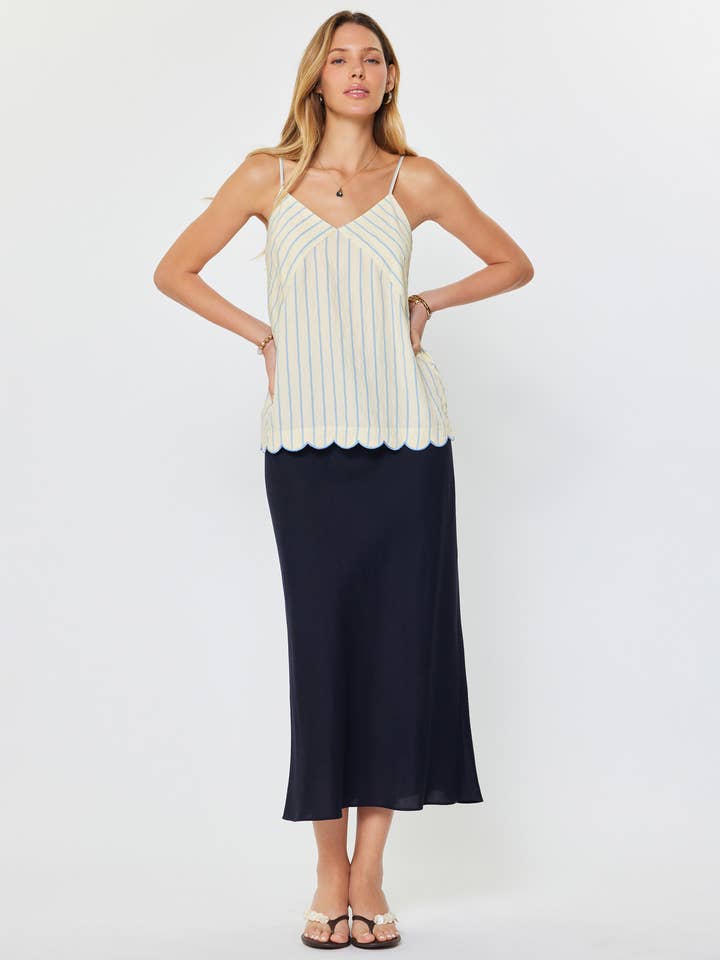 This striped Cami Top features a stylish design with a relaxed fit, making it a versatile addition to your wardrobe. It is crafted with a V-neckline, adjustable spaghetti straps, and a scalloped hem for added detail. This lightweight tank top offers comfort and ease for everyday wear or layering.