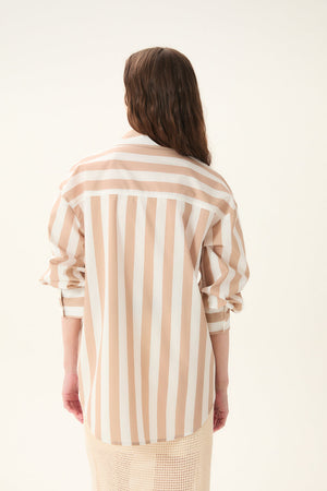 Wide pinstripes punctuate a slightly oversized shirt made from crisp cotton and finished with a curved hem that you can leave untucked. Featuring a lapel collar and long sleeves with dramatic buttoned cuffs. Wear over white trousers or dark jeans.