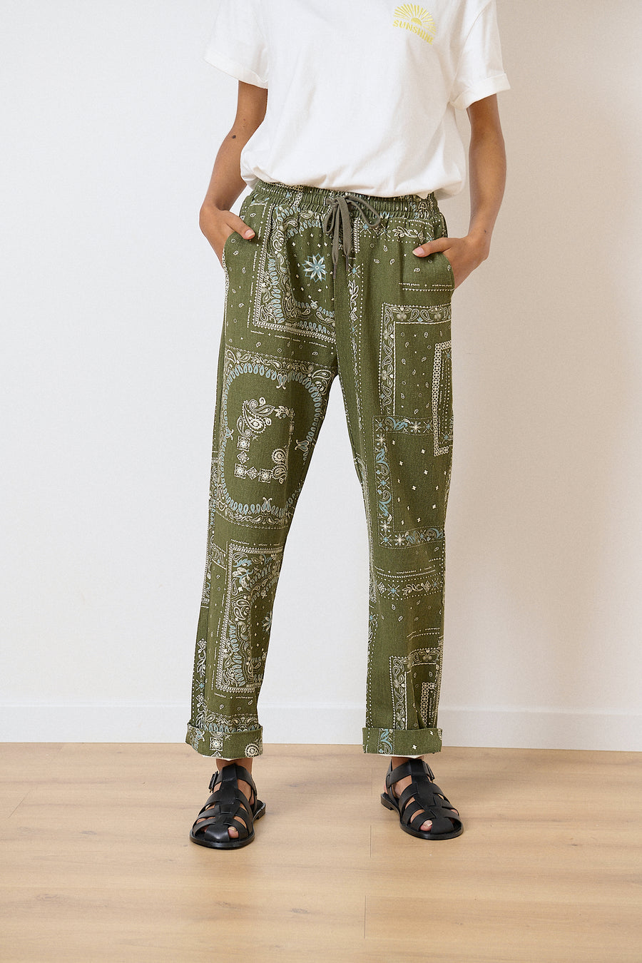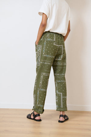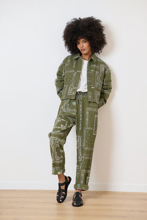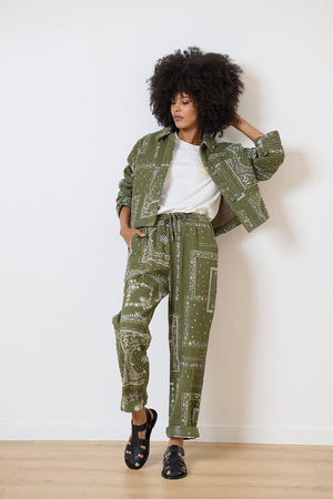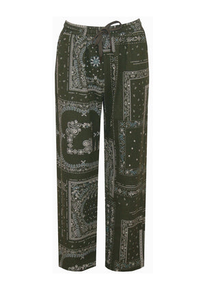 The Volt Pants are straight-leg with a bold bandana pattern. Their high waist is accented by ties with silver details, combining style and modernity. Comfortable thanks to their elasticated waistband and practical Italian pockets, they perfectly complement casual or dressy outfits.