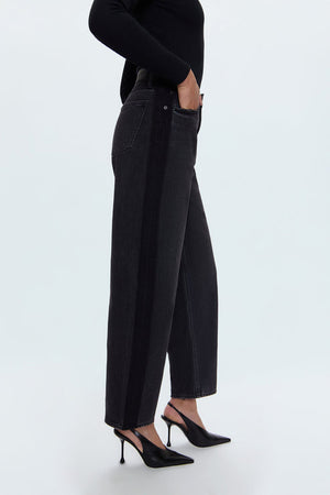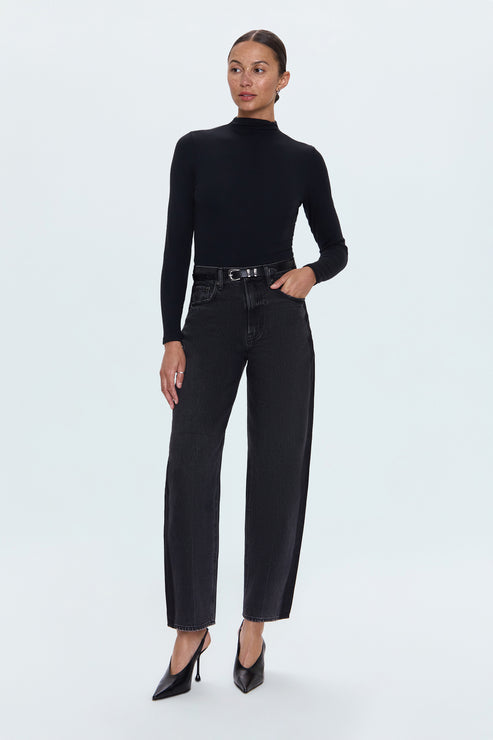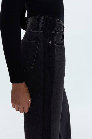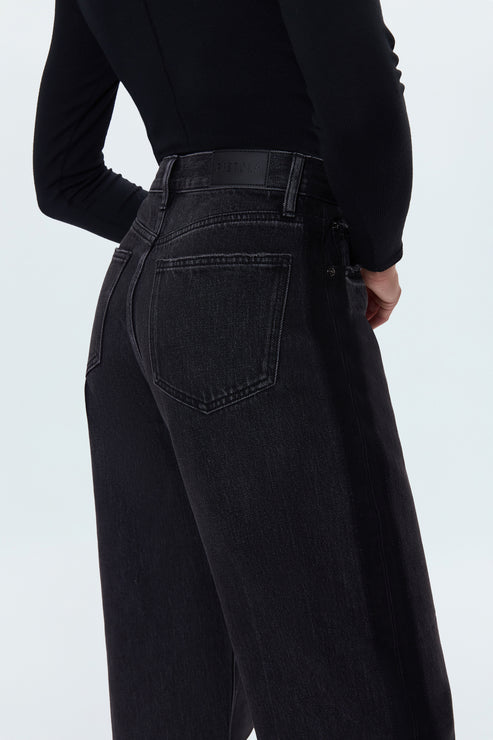 A best-selling silhouette, the Wes offers a flattering high rise and full-length 30" inseam in a stylish barrel leg that delivers sophisticated drama. Clean hems and a tuxedo stripe detail refine the shape, while premium rigid non-stretch denim in Cinema, a rich black wash, adds effortless polish and versatility.
