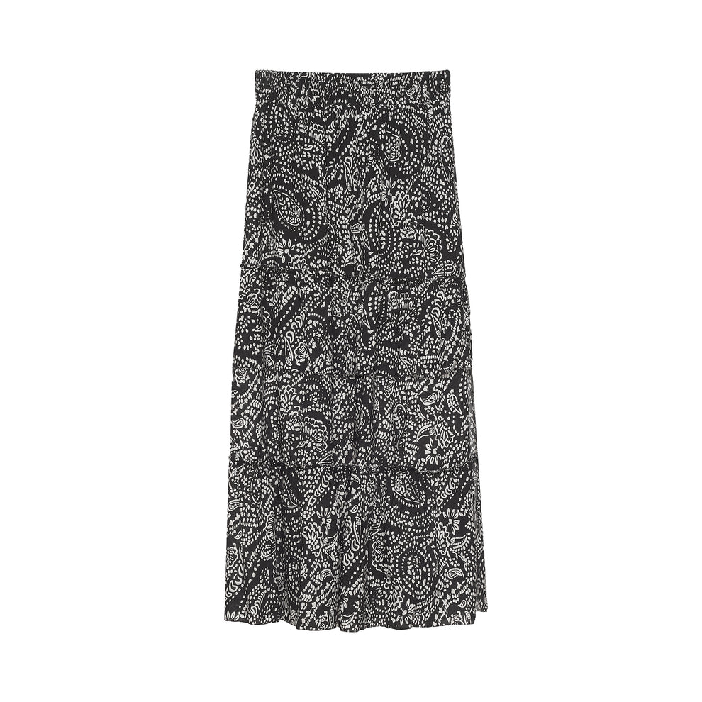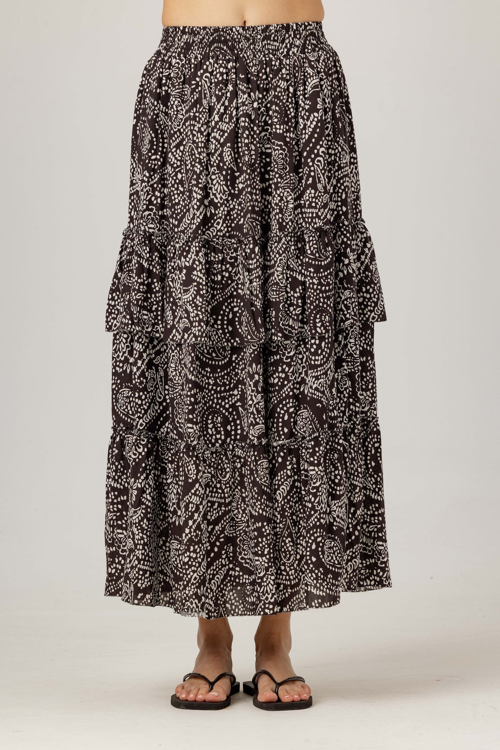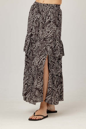 A nod to nostalgic summer prints, the Yara Skirt features a vintage-inspired bandana motif destined to become a seasonal favorite. This billowy maxi is designed with soft ruffled tiers and an effortless side slit for a flirty finish. Sitting at the natural waist with a gentle elastic waistband and ankle-grazing hem, it pairs perfectly with the matching Magalie Top for an easy, sun-soaked set.